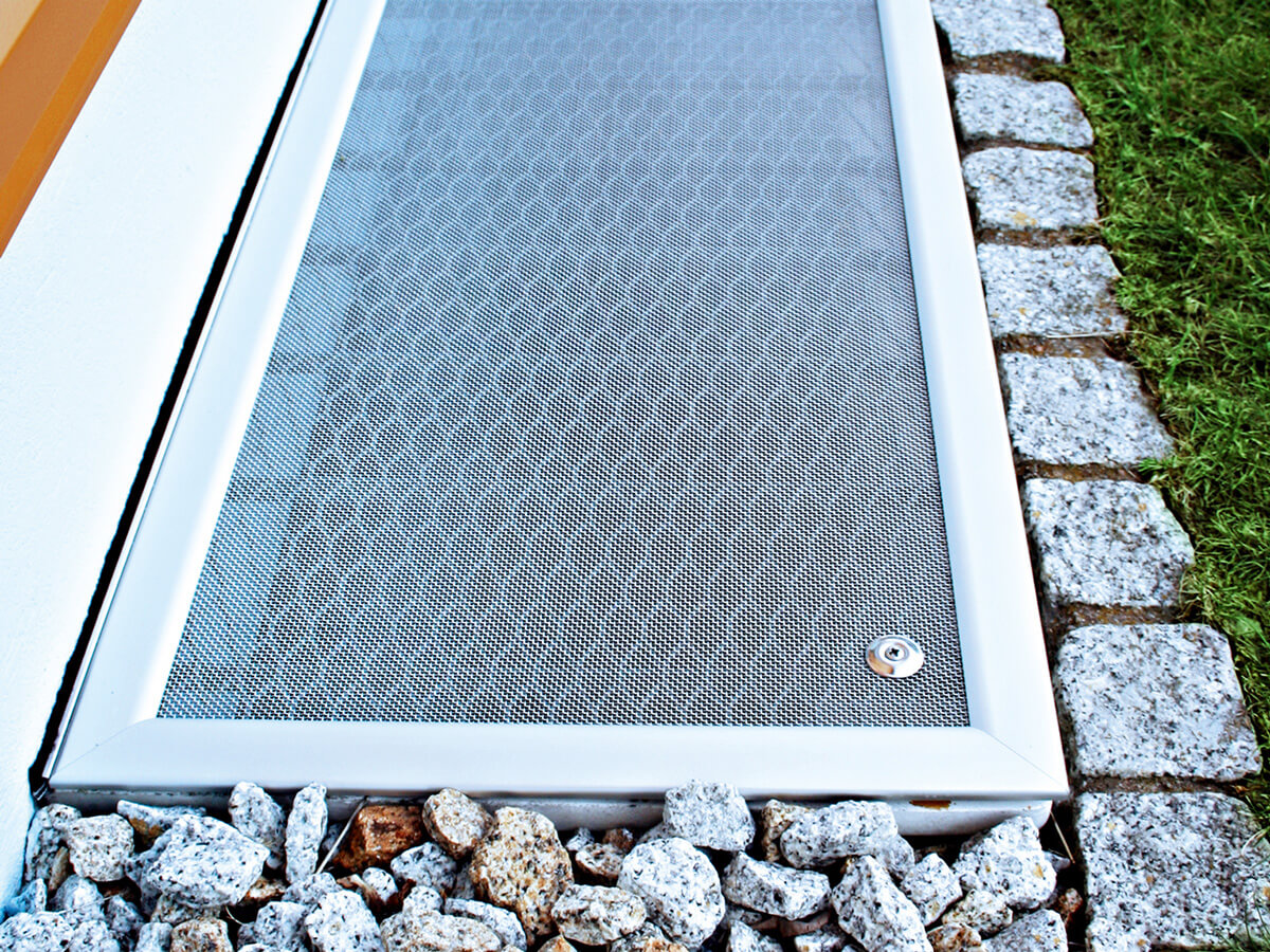 Das flache Bodenprofil der ALUKON Lichtschachtabdeckungen reduziert die Stolpergefahr und sieht dank der Edelstahl-Streckmetall-Gitter zudem noch hochwertig aus.